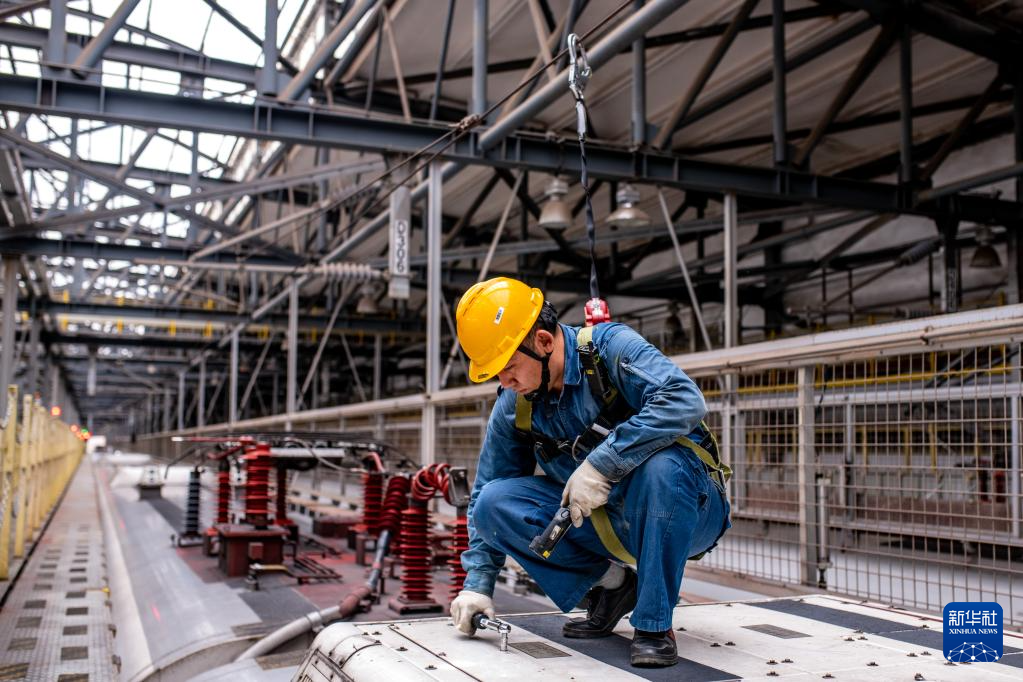 7月4日,动车所地勤机械师在动车组车顶对盖板进行扭力确认作业。