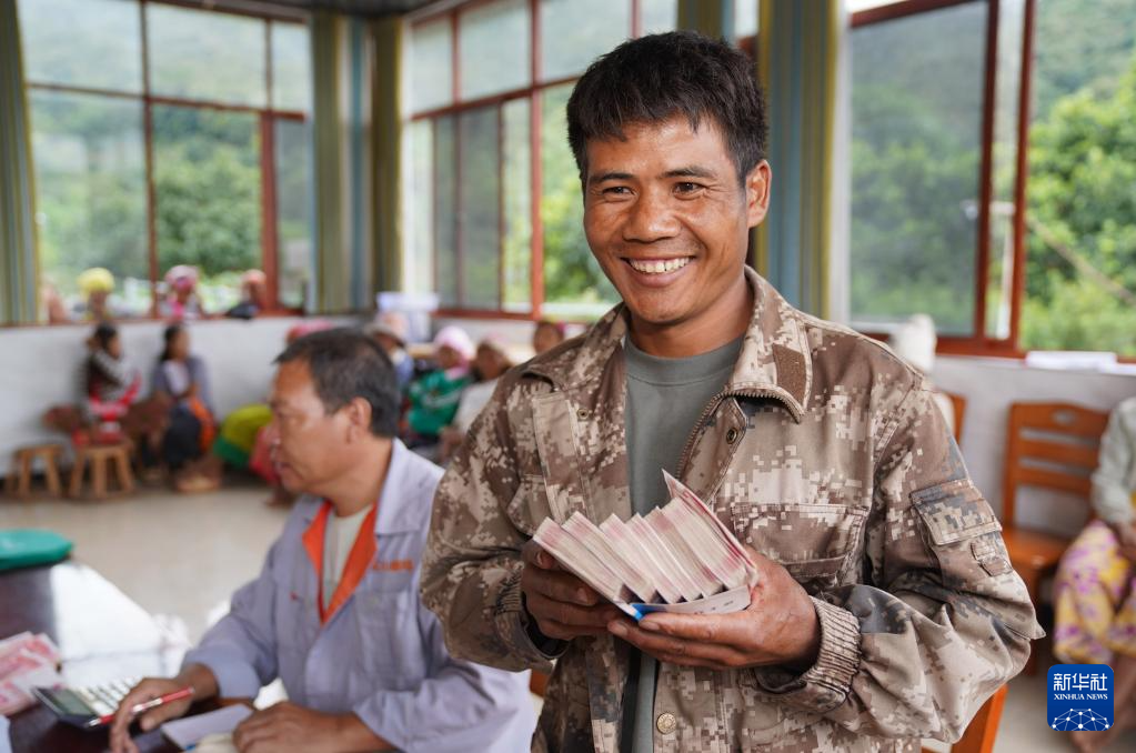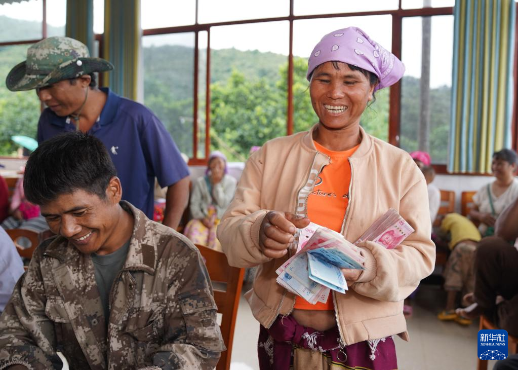 7月7日,村民在云南省普洱市孟连傣族拉祜族佤族自治县富岩镇金山咖啡专业合作社领取分红。新华社发(梁志强 摄)