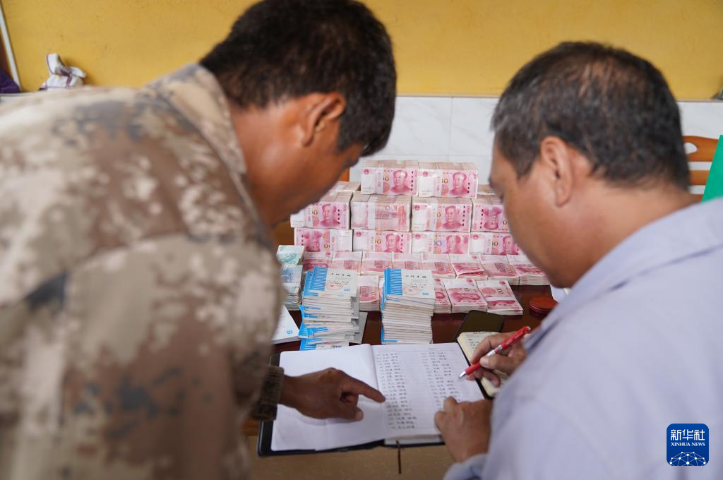 7月7日,村委会工作人员(右)在云南省普洱市孟连傣族拉祜族佤族自治县富岩镇金山咖啡专业合作社为村民登记分红金额。新华社发(梁志强 摄)