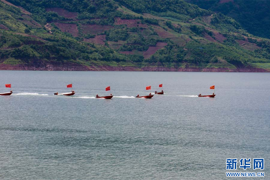 森林消防员进行舟艇编队搜救训练(7月1日摄)。新华网发(王兆富 摄)