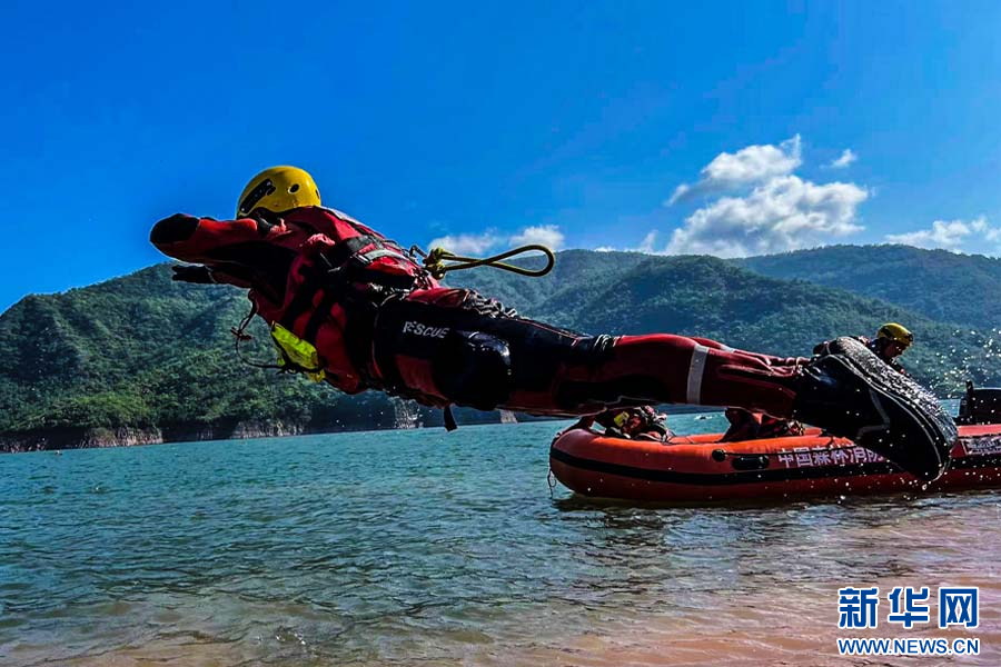 森林消防员进行入水训练(6月27日摄)。新华网发(李达富 摄)