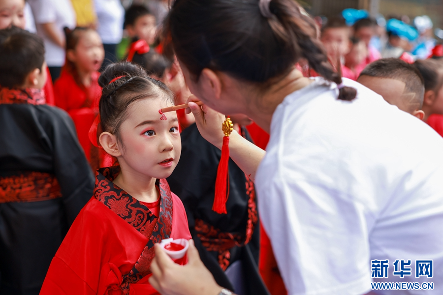 老师为小朋友点上朱砂,寓意开启智慧之门(摄于7月14日)。新华网发(陶家淇 摄)