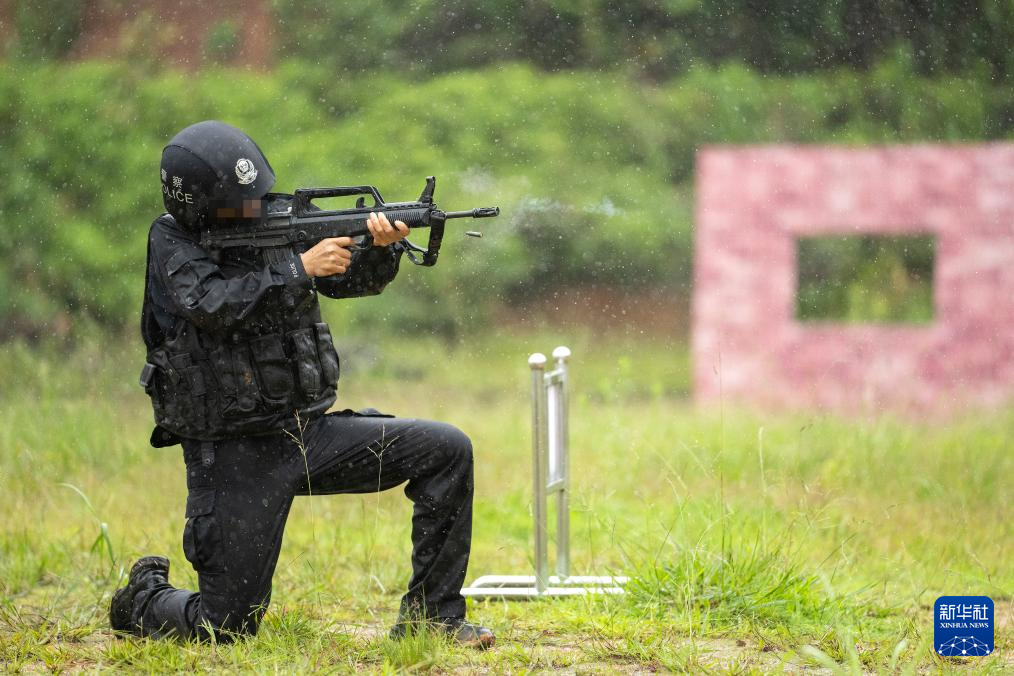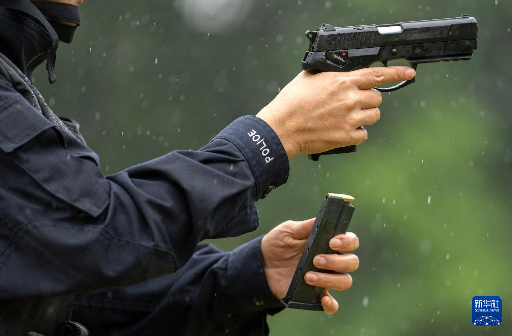 7月13日,尹铭燕在进行射击训练,地面的水洼映出她的倒影。