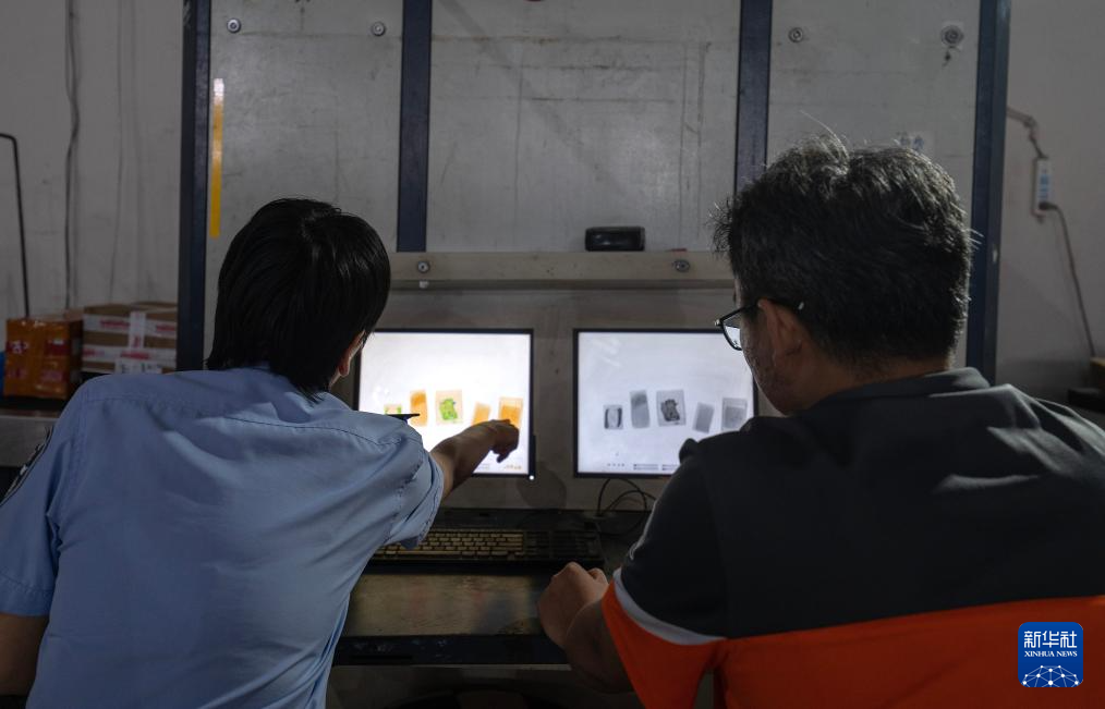 7月12日,尹铭燕(左)和同事在芒市一处物流点对快递包裹进行查缉。