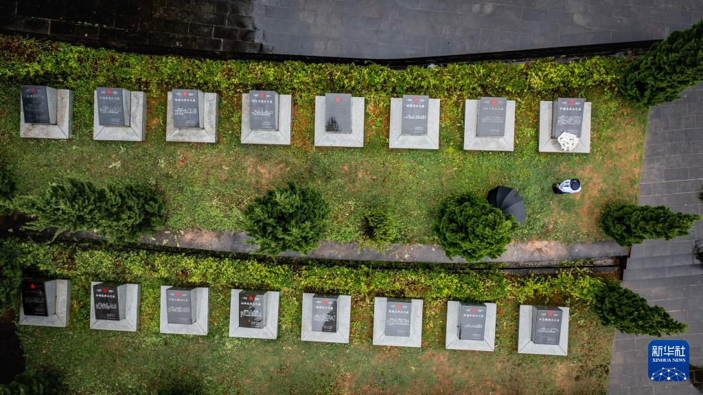 7月12日,尹铭燕在陇川县烈士陵园祭奠牺牲的哥哥尹铭志(无人机照片)。