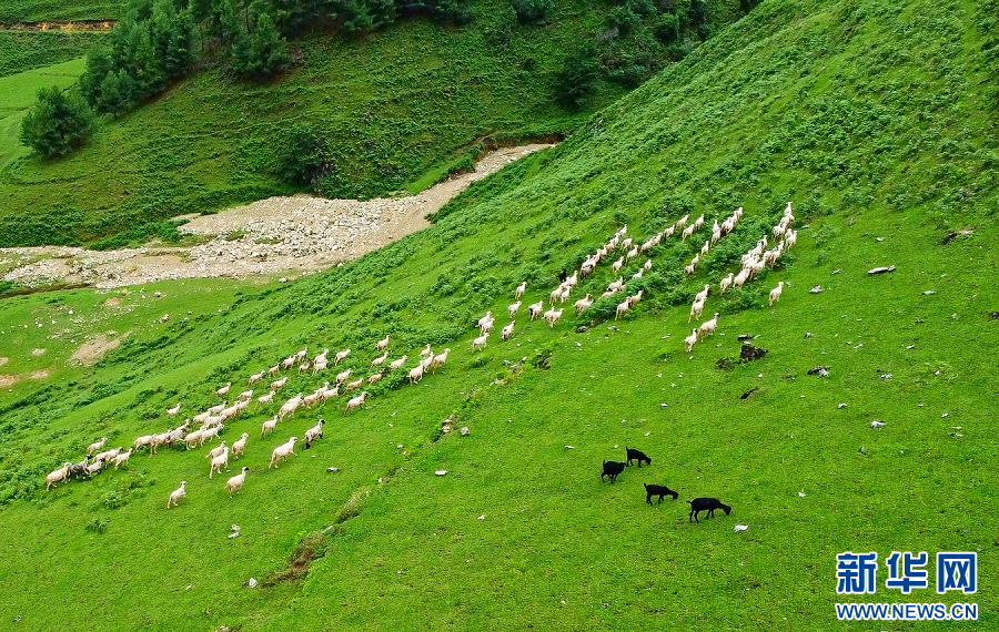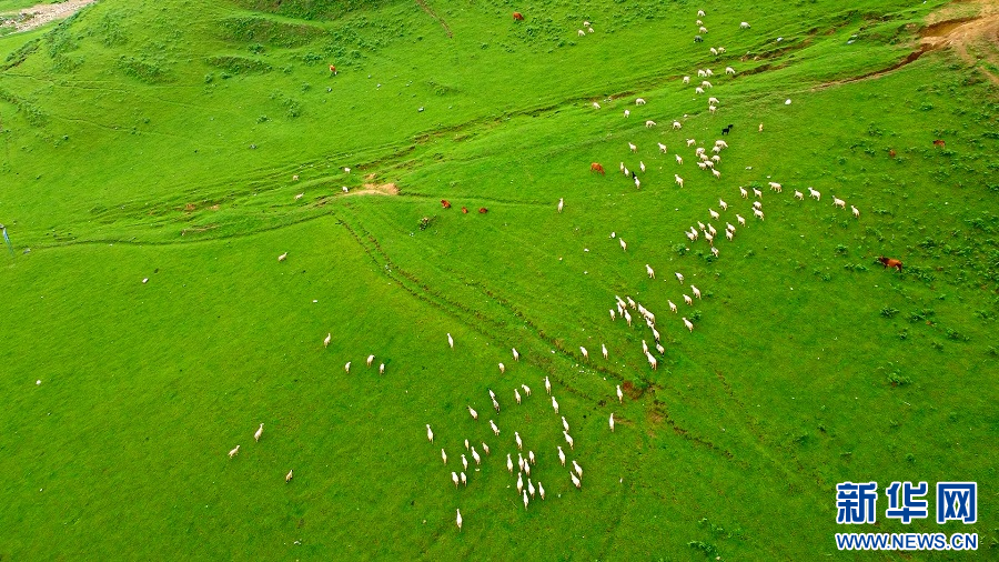 航拍草原上的牛羊(7月8日摄)。新华网发(郭康 摄)