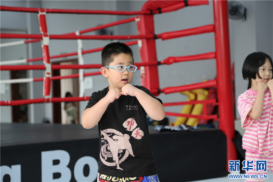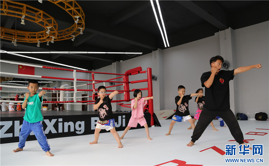 7月16日,孩子们在云南省红河州青少年宫搏击运动馆学习搏击。新华网发(薛莹莹 摄)