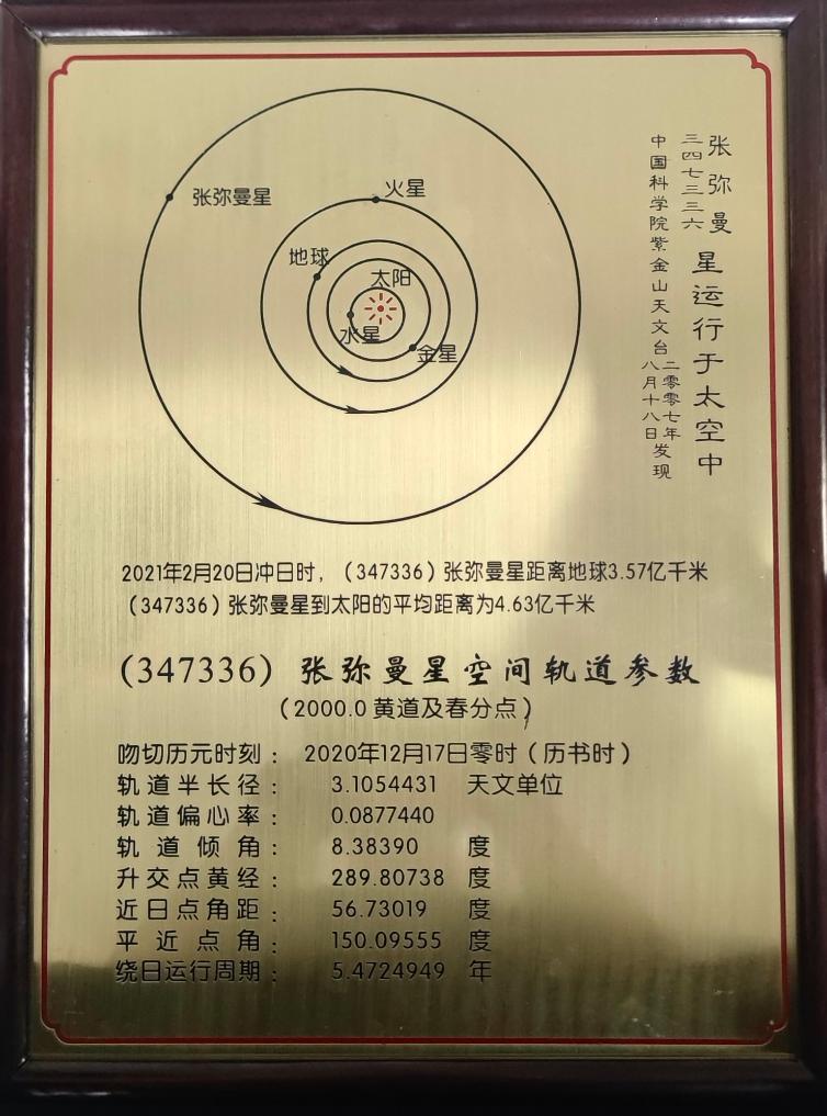 7月19日,“张弥曼星”命名仪式在云南曲靖举行。经国际小行星命名委员会批准,由中国科学院紫金山天文台发现、国际编号为347336号的小行星被正式命名为“张弥曼星”。