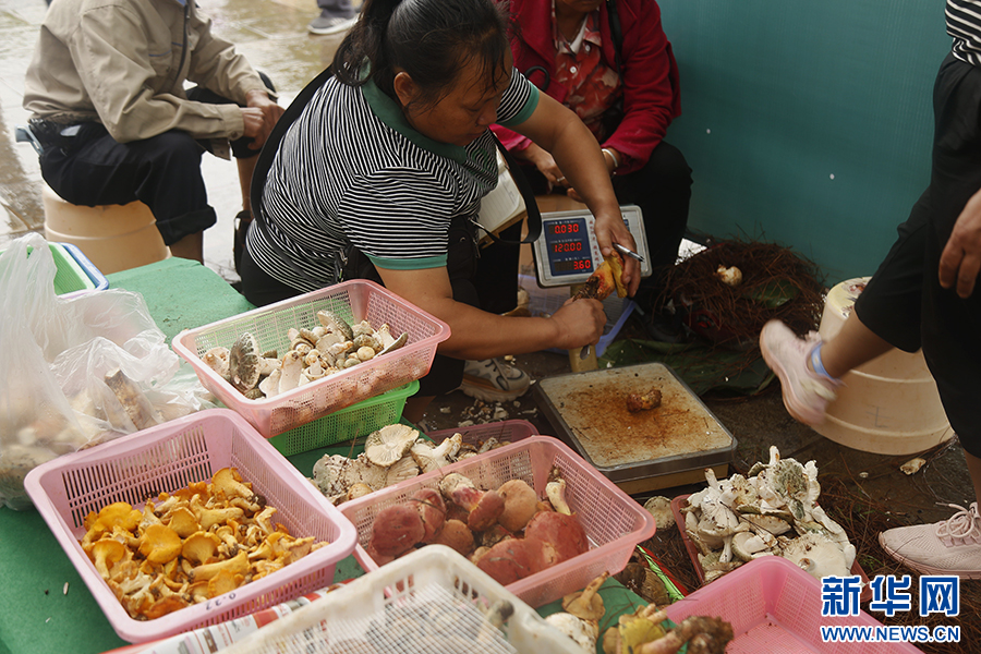 摊主为野生菌称重(7月28日摄)。新华网发(冯雨钐 摄)