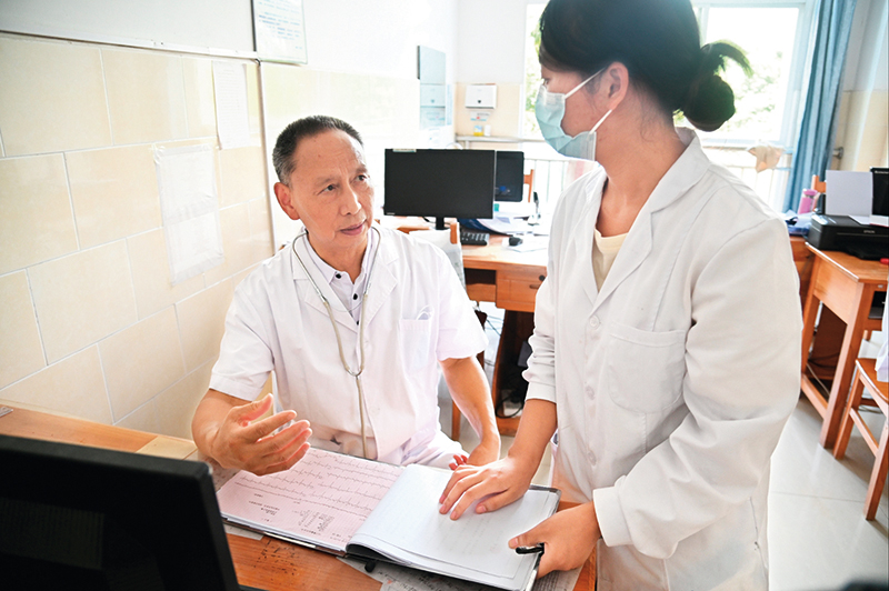 沈坤(左)与同事交流患者病情(2023年7月25日摄) 受访者供图