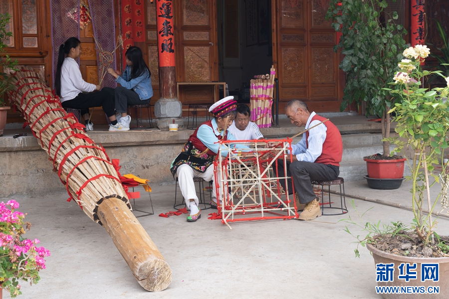 每年农历六月二十五是白族的火把节,村村寨寨都有竖火把的习俗。在杨飞梧扎制的火把中,最有特色的,是由13节组成的大火把。杨飞梧介绍,大火把通常是做12节,一节代表一个月,今年是闰二月,所以要做13节。主体部分完成后,还要再扎4层升斗,最后在火把顶端装饰上纸扎的“白鹤含松”,并在升斗上贴上“五谷丰登”“四季求财”“风调雨顺”等吉祥文字,一根大火把才宣告制作完成。工艺繁复、制作考究的火把,表达了白族群众对传统节庆的重视、对美好生活的向往。(李雪梅 杨润桃)
