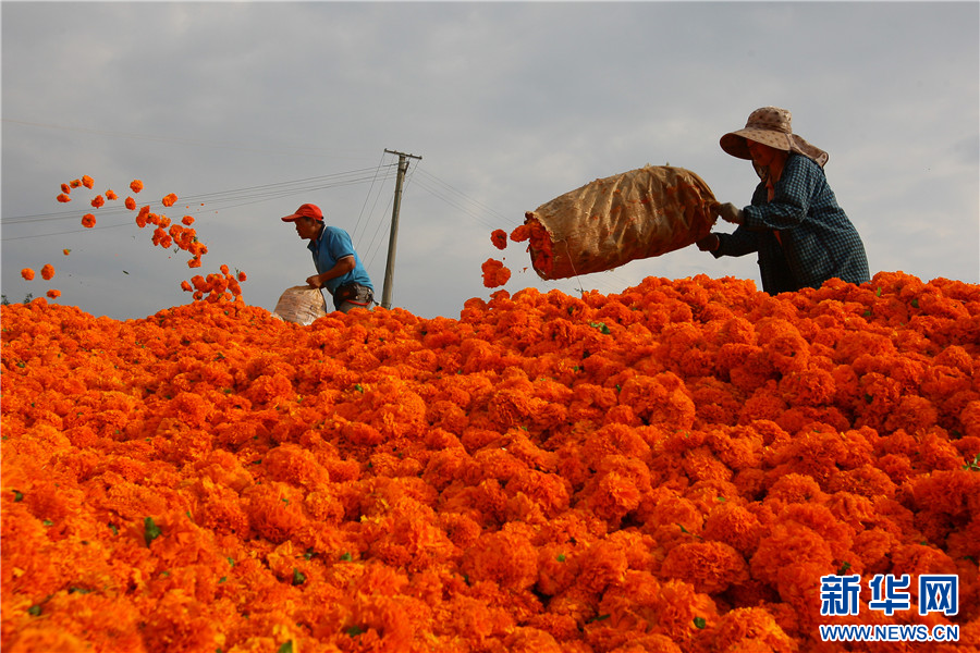 初秋时节,云南省曲靖市沾益区各地的水果、万寿菊等作物迎来丰收,农民忙着采收、搬运、分拣、包装、销售,呈现出一派喜人的丰收景象。新华网发(杨俊鹏摄影报道)