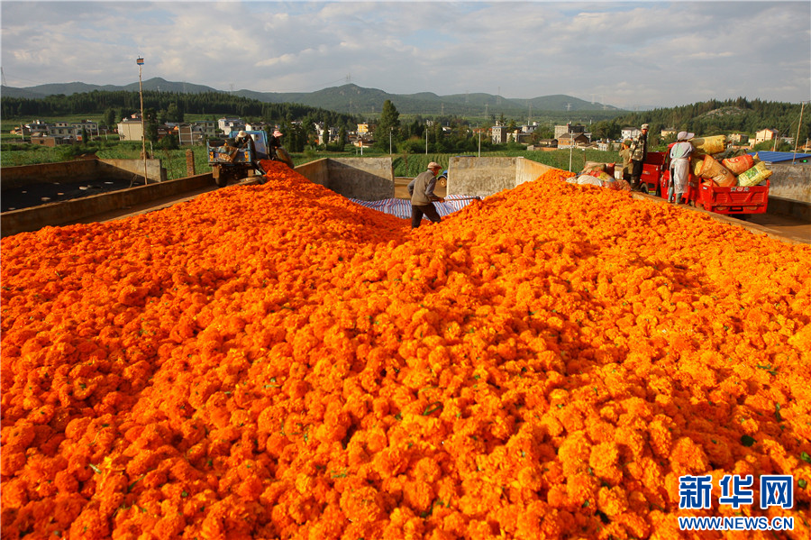8月13日,云南省曲靖市沾益区白水镇勺达村万寿菊收购点,花农将万寿菊倒入花池。