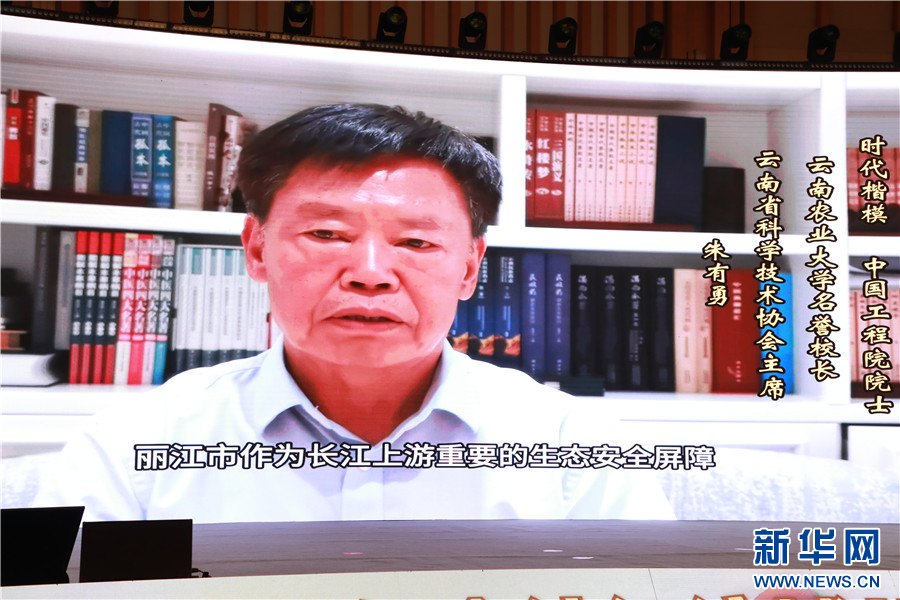 中国工程院院士朱有勇作视频致辞(8月25日摄)。新华网发(华坪县融媒体中心 供图)