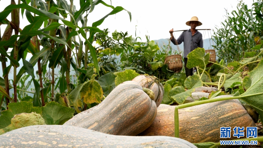 农户收南瓜(8月24日摄)。新华网发(施甸县融媒体中心供图)