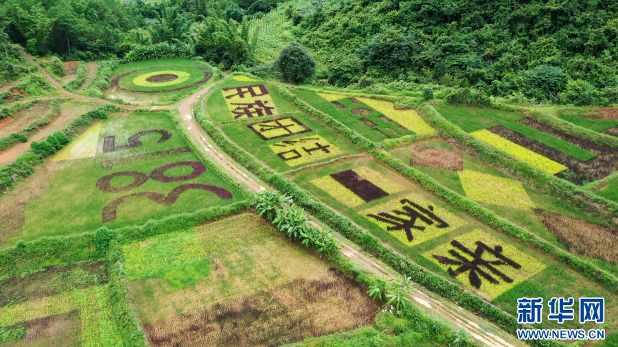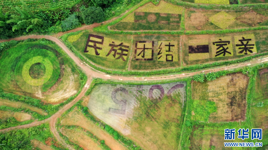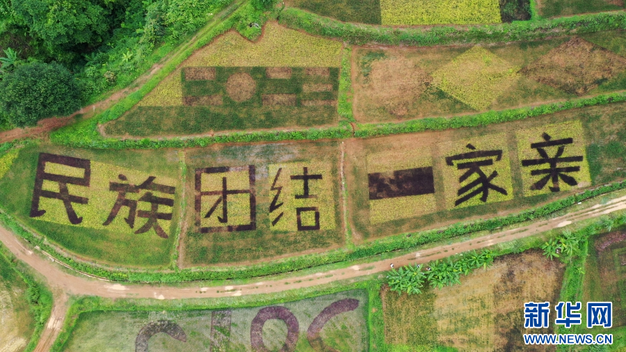 彩色稻田里“民族团结一家亲”字样(8月22日摄)。新华网发(陶平 摄 )