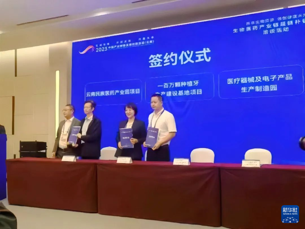 在生物医药产业链延链补链强链洽谈专题活动中,昆明高新区生物医药产业专员代表昆明高新区与云南省民族商会、江阴金泰克生物技术有限公司、众盈光电科技(深圳)有限公司分别签订了云南民族医药产业园项目战略合作协议、一百万颗种植牙生产建设基地意向协议、昆明高新区医疗器械及电子信息产业东部转移承接示范园投资协议。