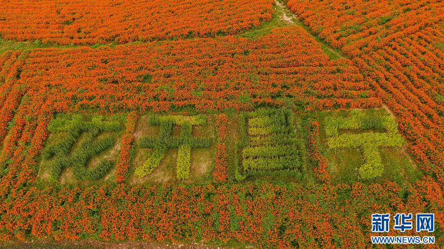 航拍镜头下万寿菊花田里“花开昌宁”字样(9月6日摄)。新华网发(刘子安 摄)
