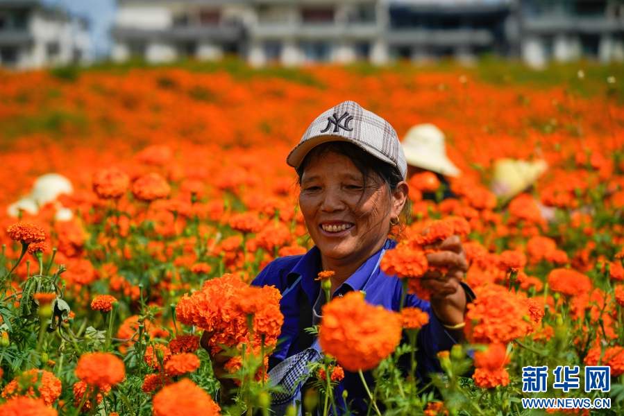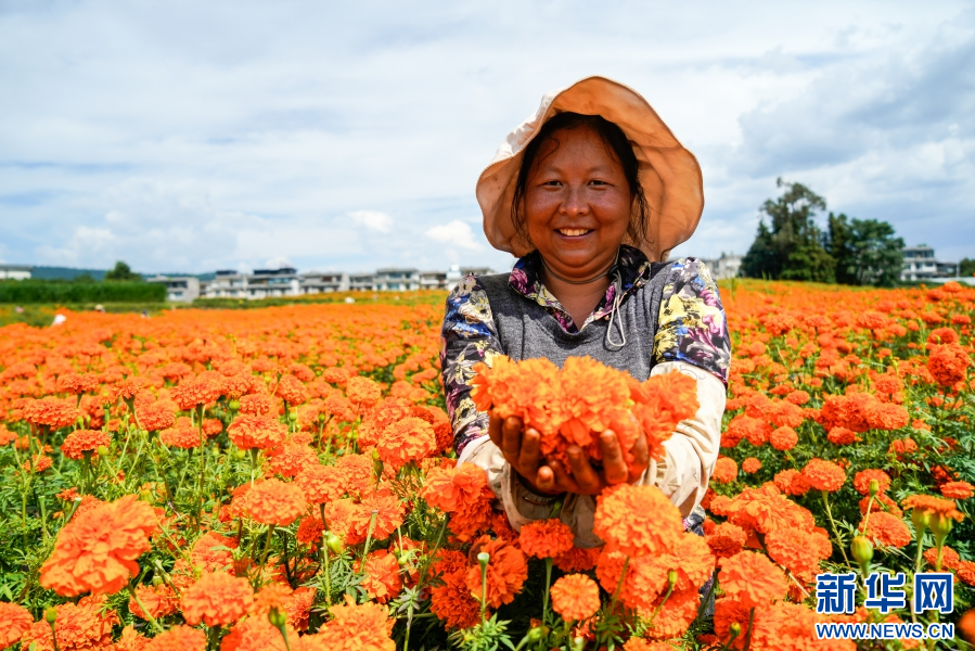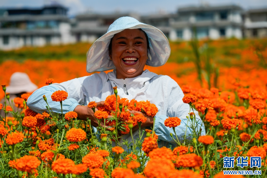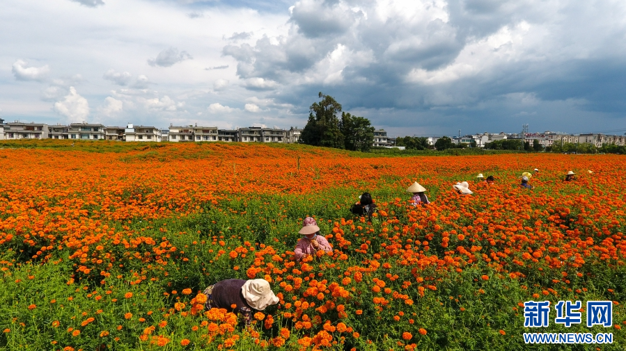 工人采收万寿菊(9月6日摄)。新华网发(刘子安 摄)