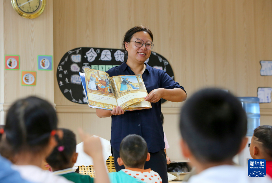 在云南省昆明市西山区前卫幼儿园,老师在为小朋友们讲故事(9月6日摄)。新华社记者 崔文 摄