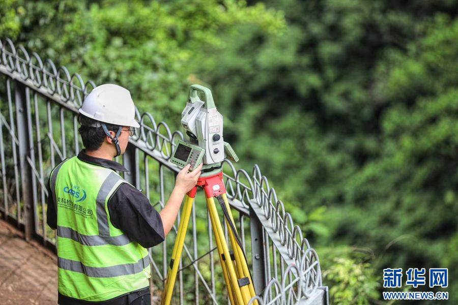 工作人员正在使用仪器采集人字桥数据(摄于9月6日)。新华网发(杨紫轩 摄)