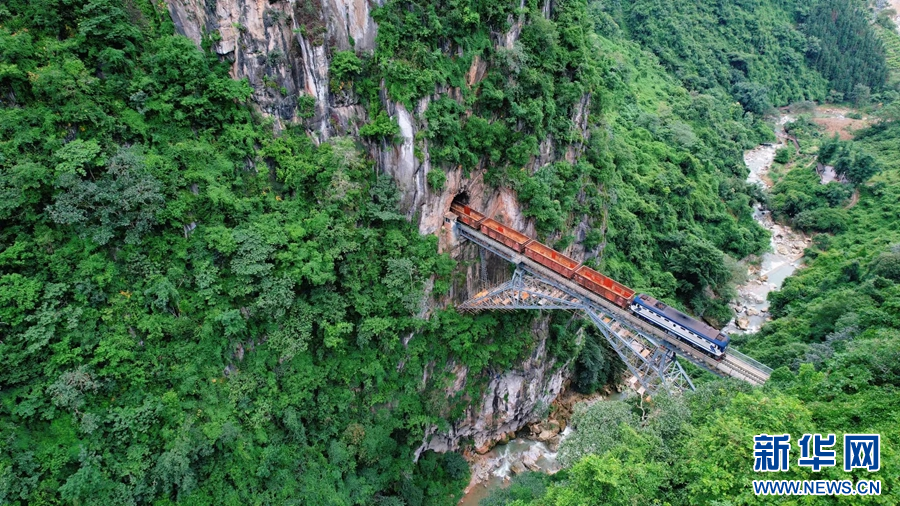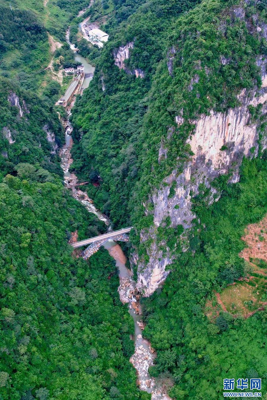 航拍视角下,架设在悬崖峭壁间的人字桥(摄于9月6日)。新华网发(杨紫轩 摄)