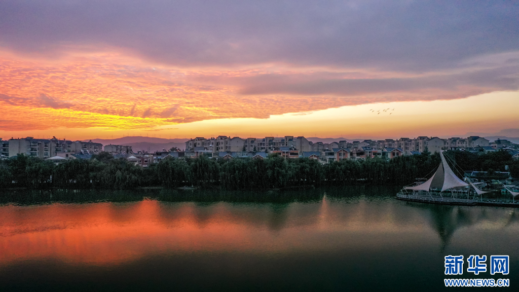 近日,云南省曲靖市上空出现火烧云美景,瑰丽多彩的朝霞倒映湖中,仿佛油画一般,整个湖面染成一片金黄,美得令人惊艳!