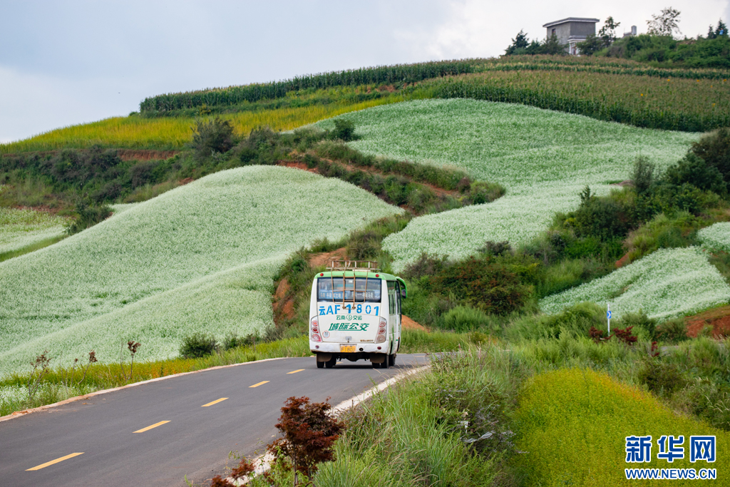 行驶在东川红土地景区中的城际公交(9月9日摄)。新华网发(郑益 摄)