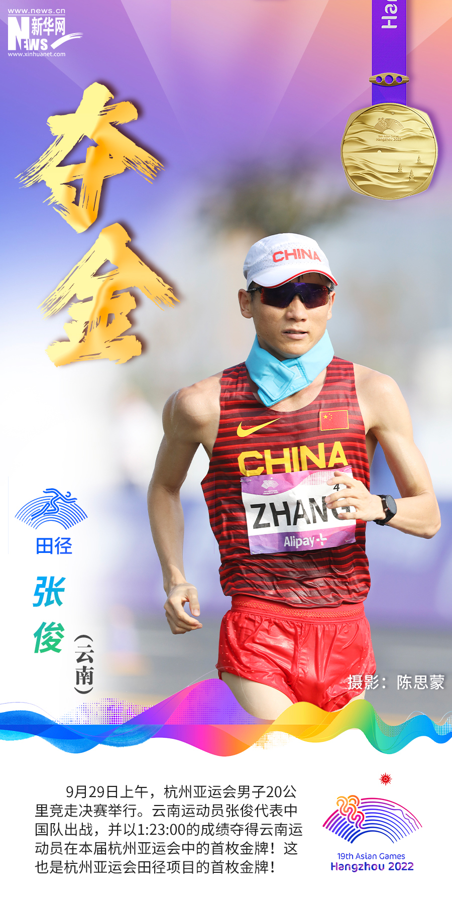 9月29日上午,杭州亚运会男子20公里竞走决赛举行。云南运动员张俊代表中国队出战,并以1:23:00的成绩将云南运动员在本届杭州亚运会中取得的首枚金牌收入囊中。这也是杭州亚运会田径项目的首枚金牌!(完)