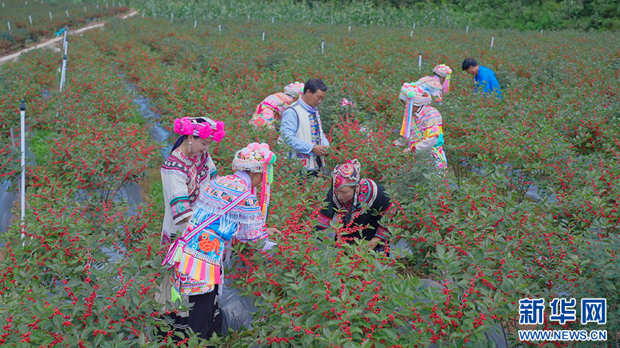 九月,在位于云南省楚雄彝族自治州武定县猫街镇三家村的武定县尚农红果种植基地里,北美冬青随风摇曳,晶莹剔透。