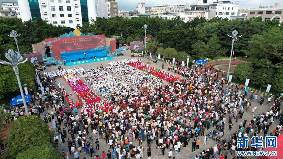 航拍视角下,人们齐聚花灯广场,共同庆祝民歌节、美食节开幕(10月1日摄)。新华网发(弥渡县融媒体中心供图)