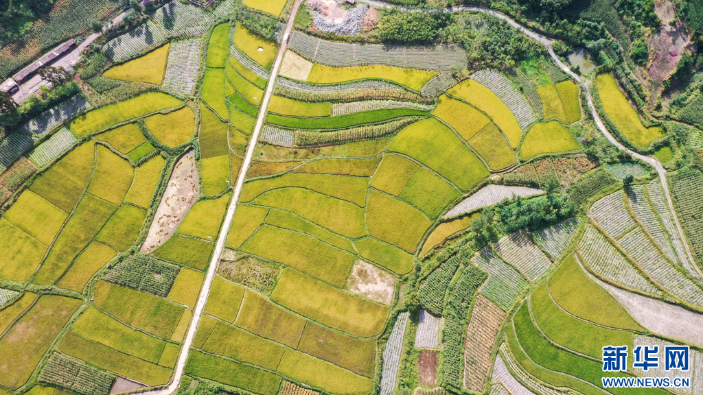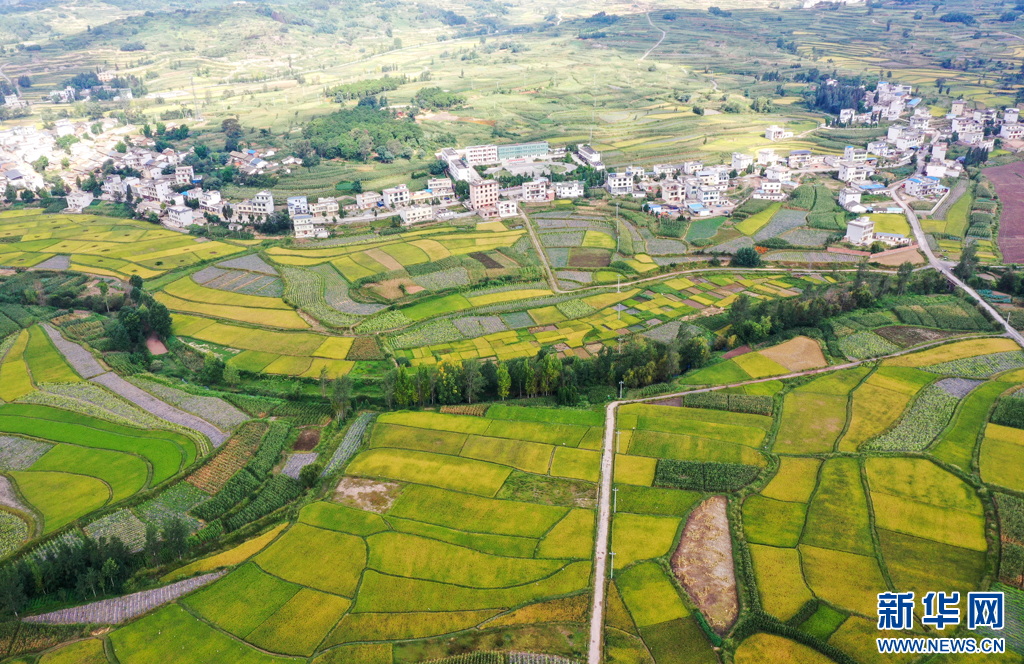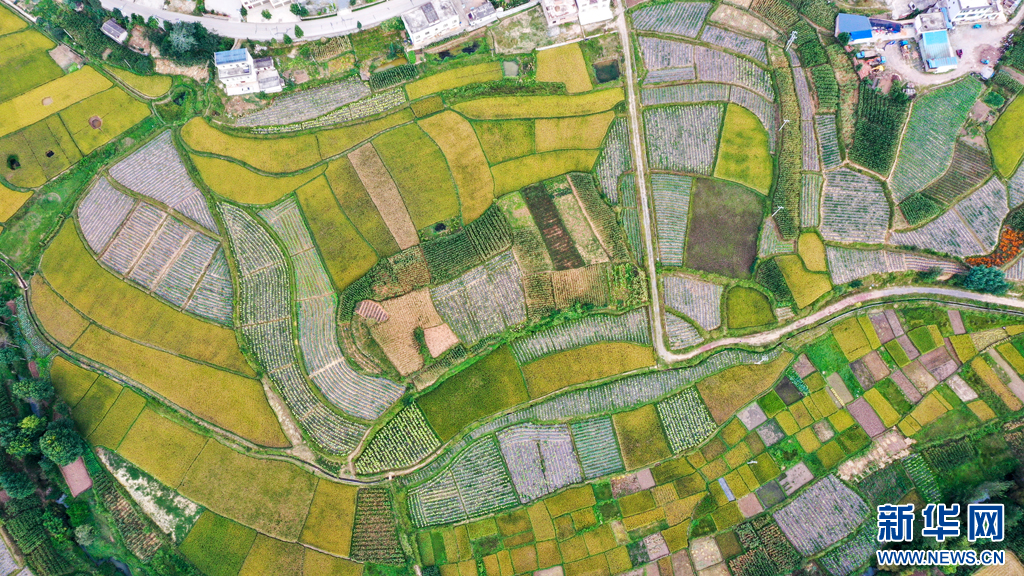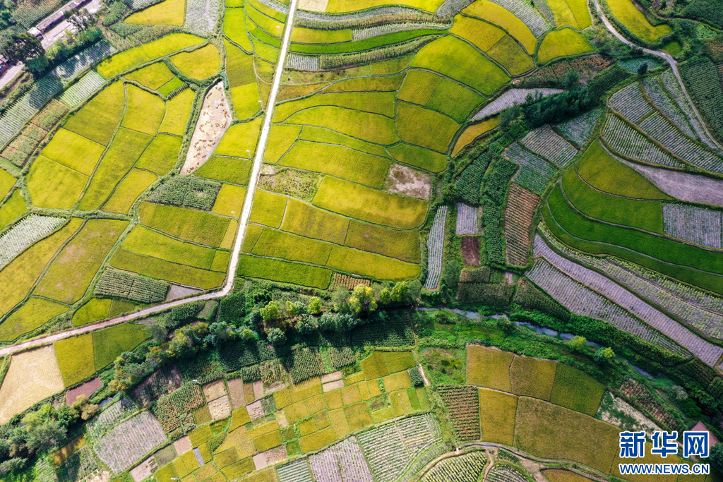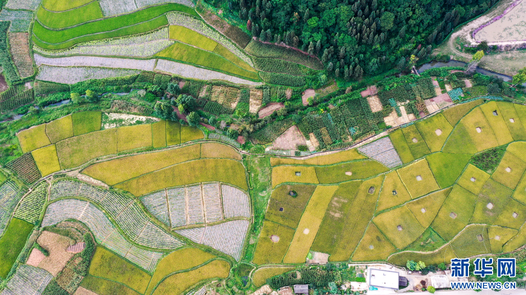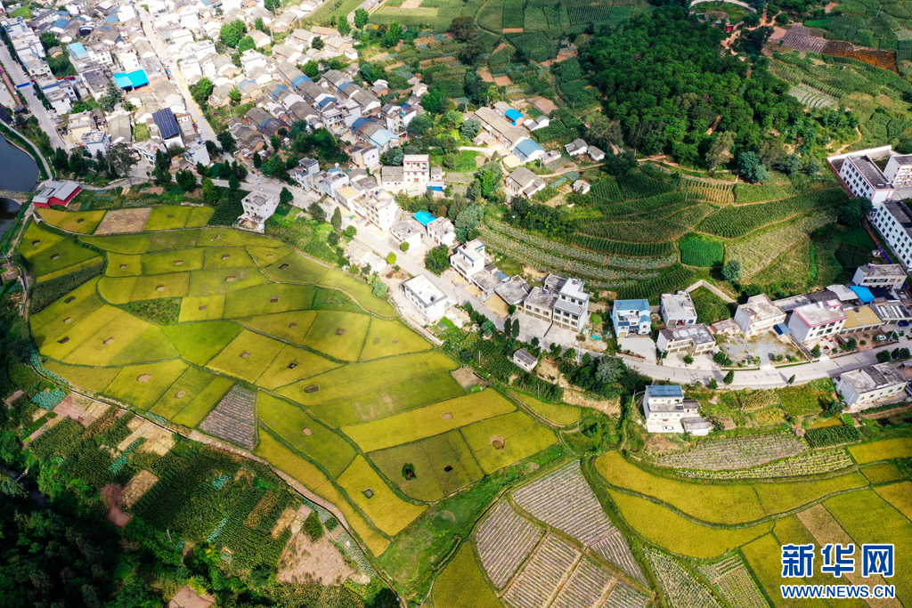 俯瞰稻黄乡村美(9月25日摄)。新华网发(孙文来 摄)