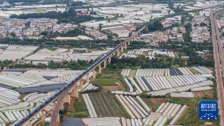 10月8日,“沪滇·澜湄线”国际货运班列驶出昆明市王家营西站(无人机照片)。新华社记者 胡超 摄