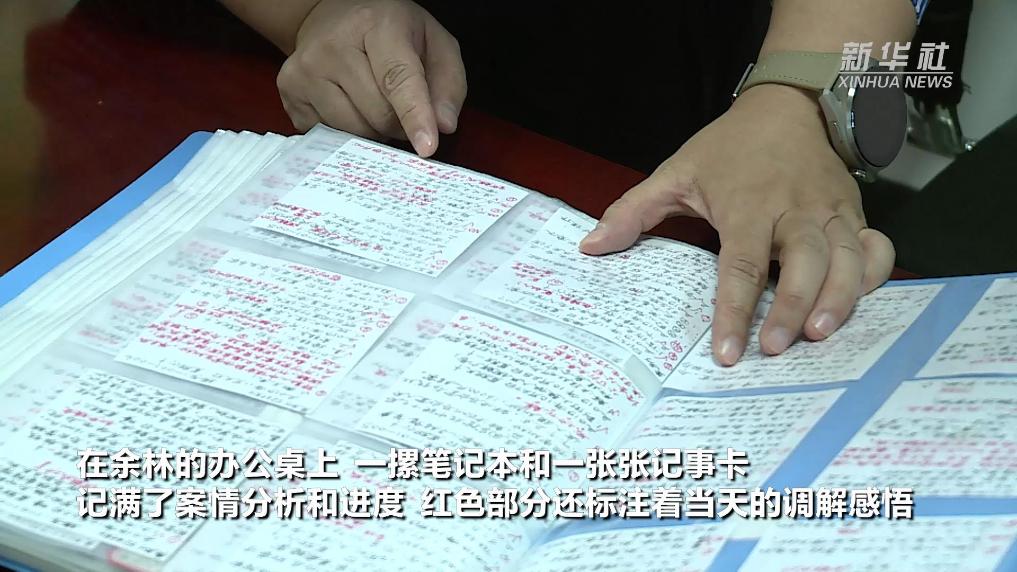 余林身上有一股劲,纠纷不解誓不休。在余林的办公桌上,一摞笔记本和一张张记事卡,记满了案情分析和进度,红色部分还标注着当天的调解感悟。