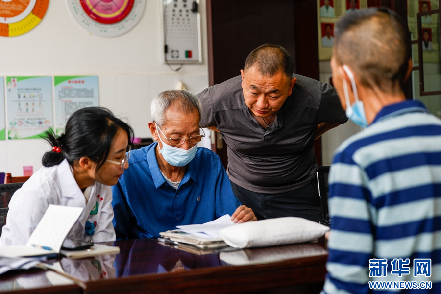 义诊工作室里,李伯藩带着两名年轻人,一起为患者诊断病情(摄于7月12日)。新华网 赵普凡 摄