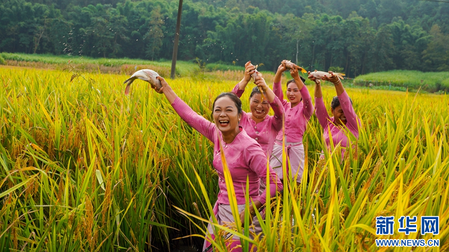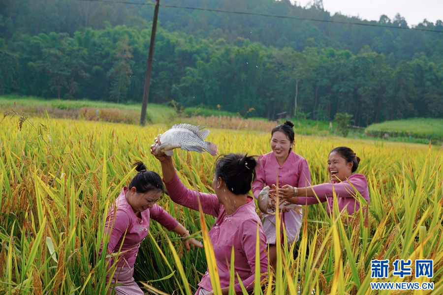 农户们开心地向大家展示抓到的鱼 (10月5日摄)。新华网发(孔扎选晶 摄)