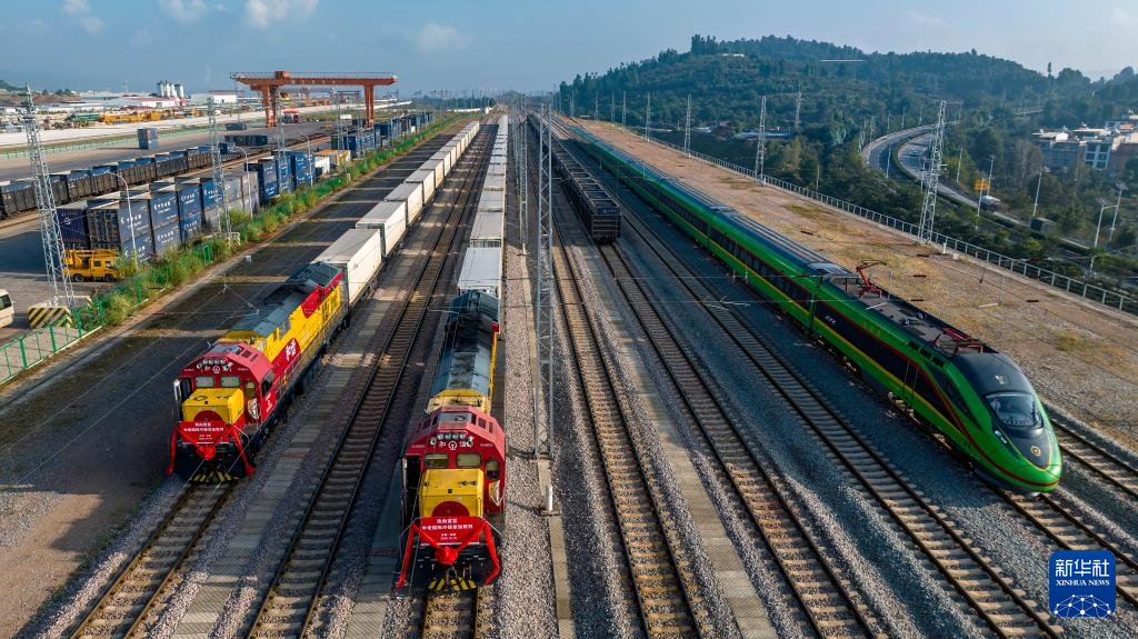 10月16日,在云南省玉溪市研和站,D887次复兴号中老铁路国际旅客列车(右)从中老、中越国际冷链货运班列旁驶过(无人机照片)。