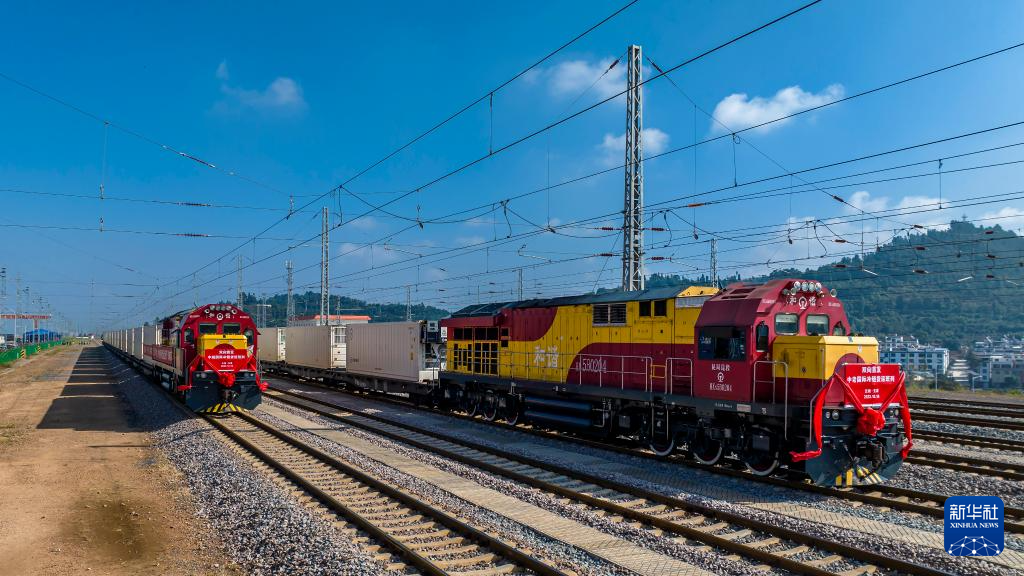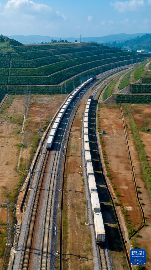 10月16日,中老、中越国际冷链货运班列从云南省玉溪市研和站发车启程(无人机照片)。