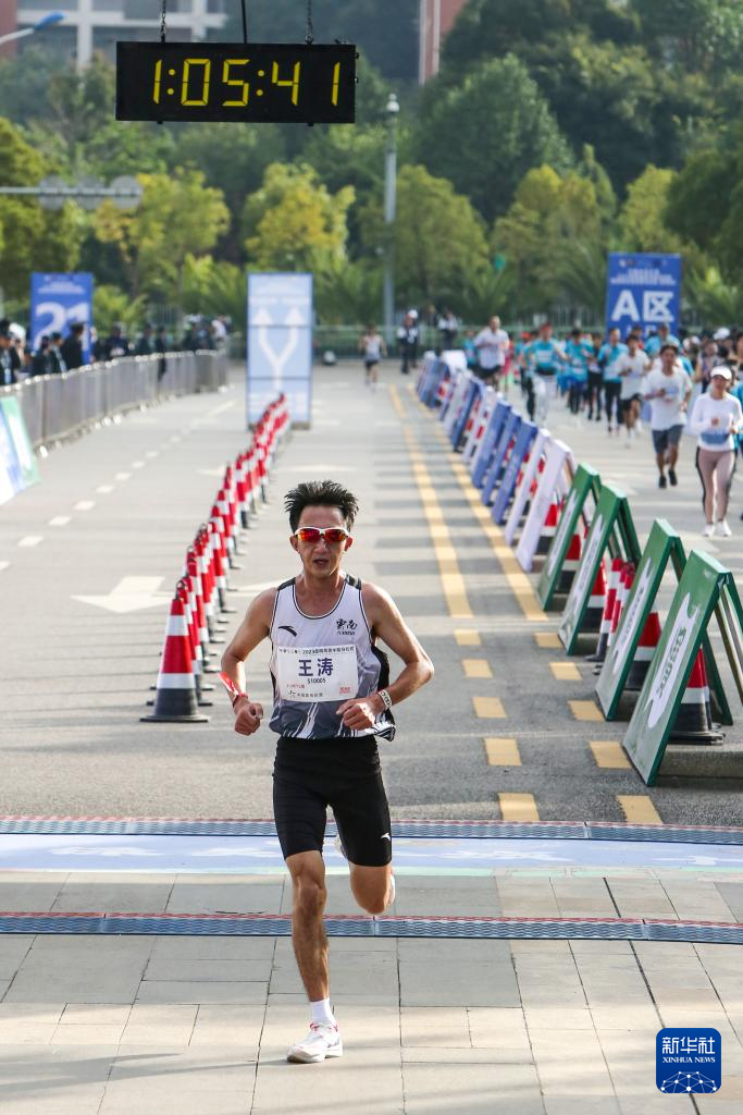 10月22日,中国选手王涛冲过终点,他获得男子半程马拉松亚军。新华社记者 崔文 摄