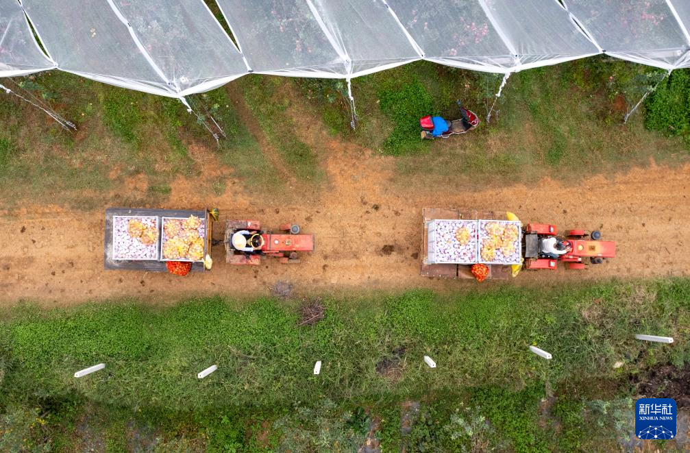 10月30日,果农在昭通市一处苹果基地内运送苹果(无人机照片)。新华社记者 陈欣波 摄