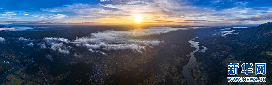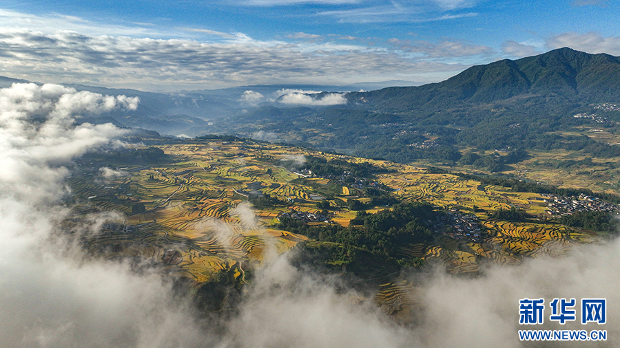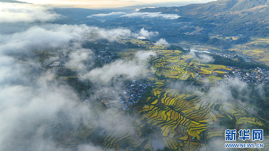 在龙江乡拍摄到的云雾下的美丽稻田(10月24日摄)。新华网发(杨磊 摄)