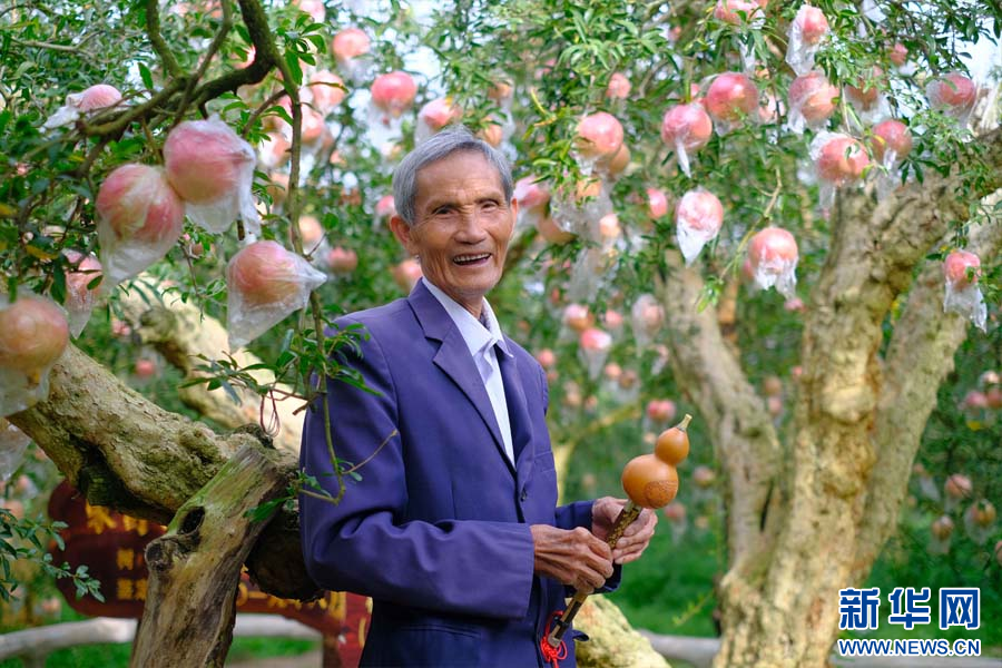 85岁的老种植户在古树石榴前留影(10月26日摄)。新华网发(张珏 摄)