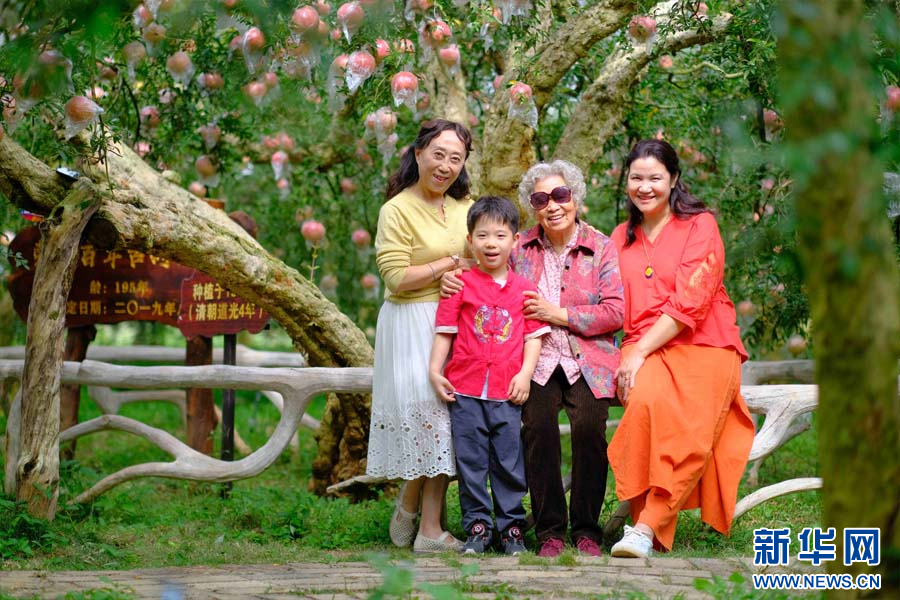 游人在古树石榴园合影(10月26日摄)。新华网发(张珏 摄)