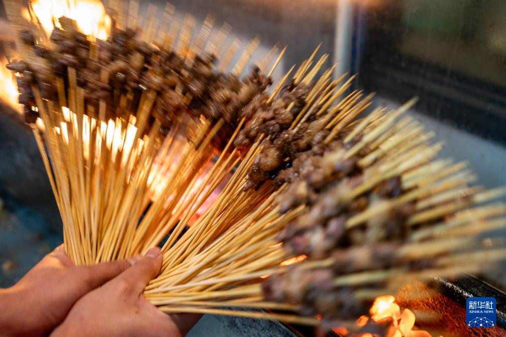 11月2日在昭通市昭阳区一家烧烤店内拍摄的正在烤制的小肉串。新华社记者 陈欣波 摄