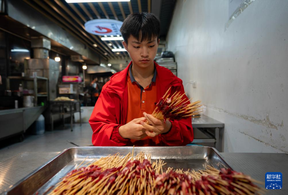 11月2日,一名小肉串烧烤从业人员在昭通市昭阳区一家烧烤店内数小肉串。新华社记者 陈欣波 摄