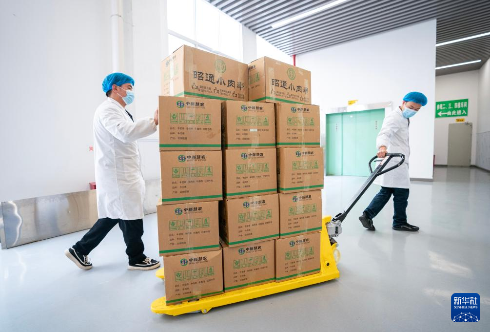 11月3日,工作人员在昭通市昭阳区中新慧农供应链小肉串中央工厂搬运小肉串。新华社记者 陈欣波 摄