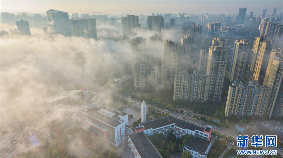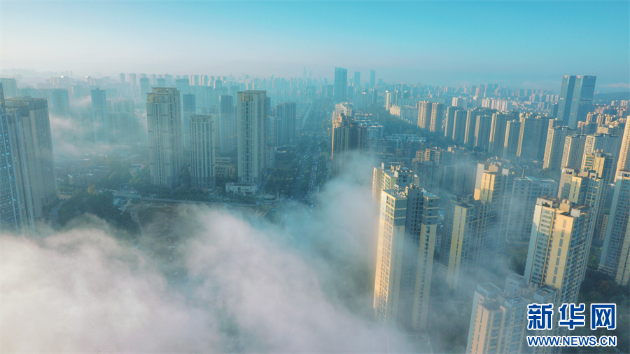 云雾与城市勾勒出一幅奇幻的冬日美景(11月20日摄)。新华网发(杨景浩 摄)