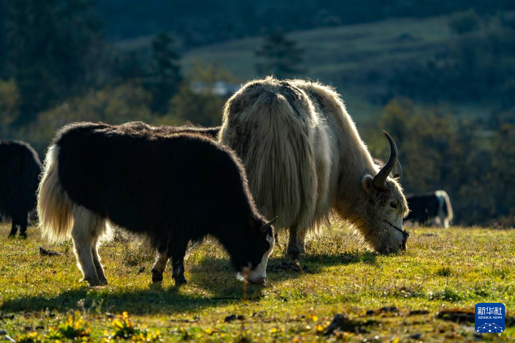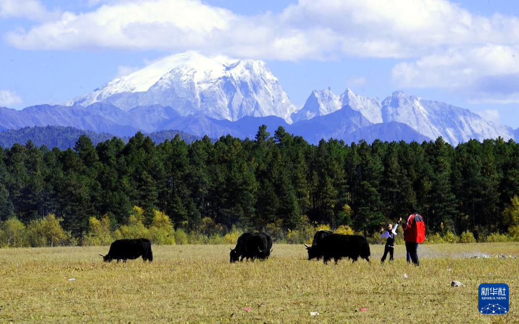 香格里拉哈巴雪山下,游人和牦牛合影。