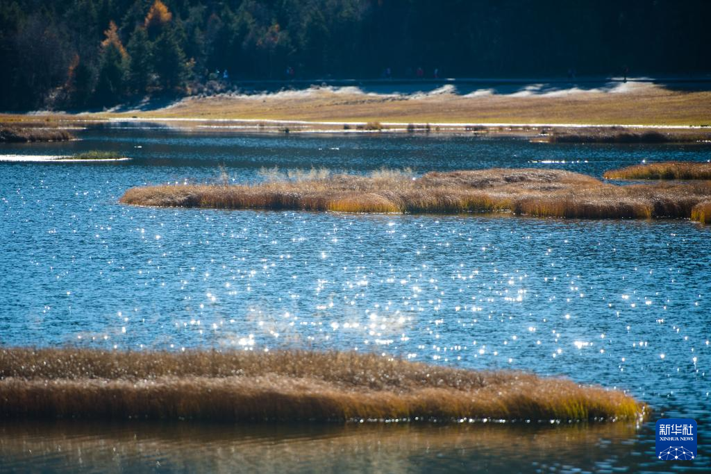 黑颈鹤和水鸟在纳帕海自然保护区栖息。