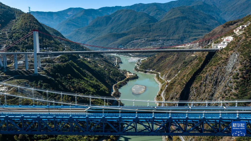 11月26日,列车驶过虎跳峡金沙江铁路大桥(无人机照片)。新华社记者 胡超 摄